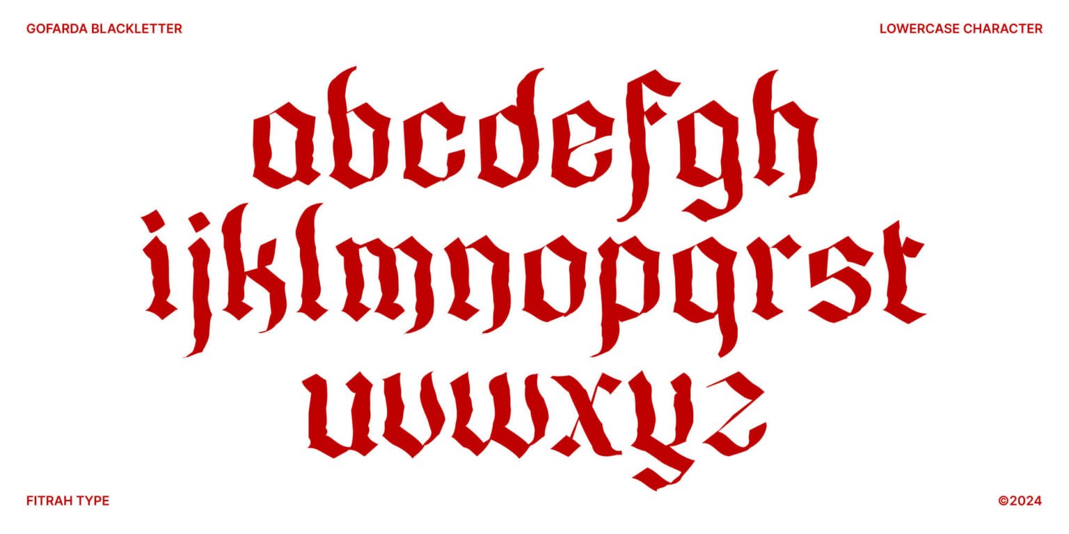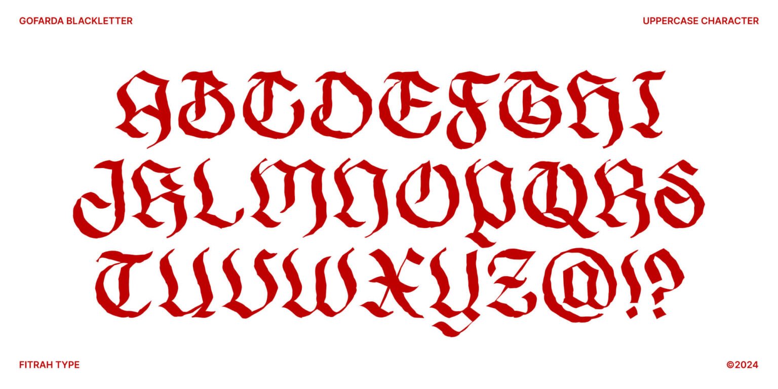 Gofarda Gothic is a modern interpretation of the classic blackletter style, designed to resonate with contemporary aesthetics while retaining the intricate charm of traditional typography. This typeface offers two distinct styles: Regular and Distort. The Regular style showcases clean lines and precise forms, making it suitable for various design projects.